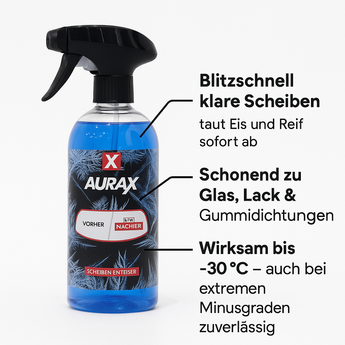 Mit dem Aurax Scheibenenteiser startest du stressfrei in den Tag! Die leistungsstarke Formel entfernt Eis und Frost in Sekunden, ganz ohne Kratzen. Einfach aufsprühen, kurz einwirken lassen, und schon sind deine Autoscheiben wieder glasklar. Schonend zu Glas und Gummidichtungen, effektiv bis -30°C und ideal für präventiven Schutz vor neuer Vereisung. Aurax – für Sicherheit und Komfort an frostigen Tagen.